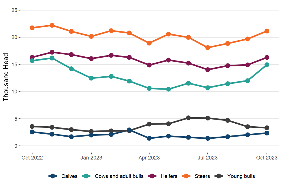 Monthly UK statistics on cattle, sheep and pig slaughter and meat production – October 2023 (published 16 November 2023)