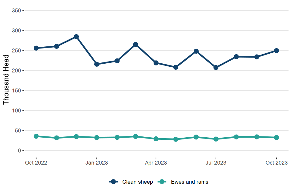 UK clean sheep slaughterings were down 2.5% on October 2022 at 1105,000 head. Mutton and lamb production was 25,000 tonnes, 3.6% lower than in October 2022.