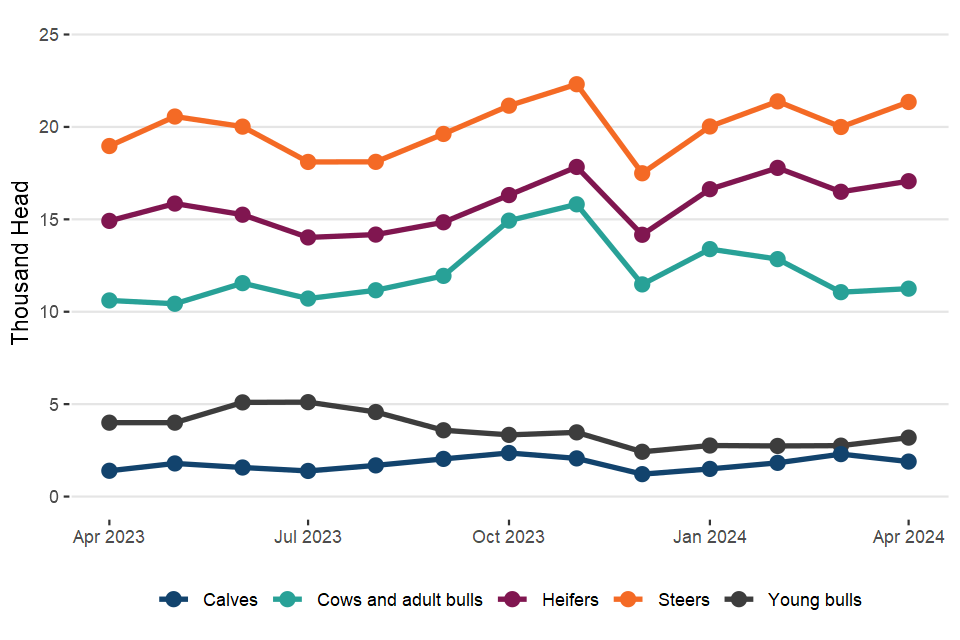 UK prime cattle (steers, heifers and young bulls) slaughterings in April 2024 were up 9.8% on April 2023 at 178,000 head. Beef and veal production was 76,000 tonnes, 7.9% higher than in April 2023.