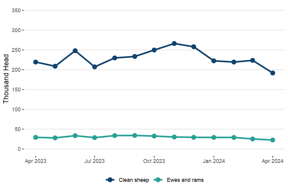 UK clean sheep slaughterings were down 13% on April 2023 at 822,000 head. Mutton and lamb production was 21,000 tonnes, 5.1% lower than in April 2023.
