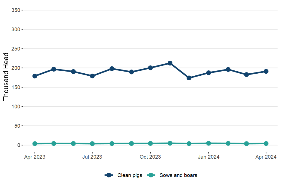 UK clean pig slaughterings were up 6.8% on April 2023 at 819,000 head. Pigmeat production was 77,000 tonnes, 8.2% higher than in April 2023.