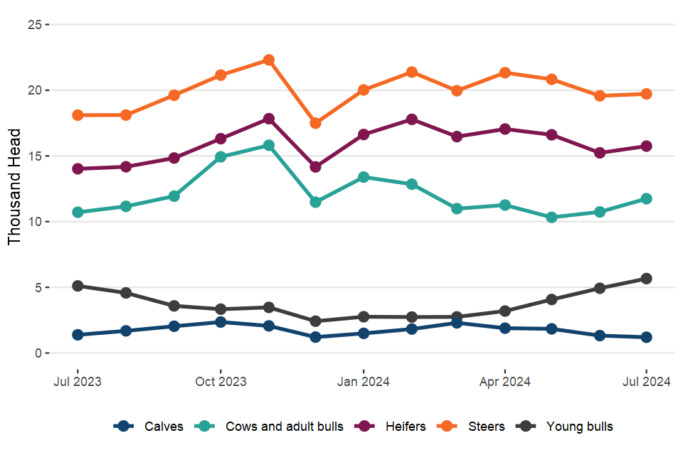 UK prime cattle (steers, heifers and young bulls) slaughterings in July 2024 were up 10% on July 2023 at 182,000 head. Beef and veal production was 81,000 tonnes, 12% higher than in July 2023.