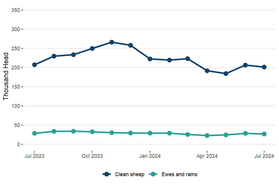 UK clean sheep slaughterings were down 2.9% on July 2023 at 892,000 head. Mutton and lamb production was 19,000 tonnes, 12% lower than in July 2023.