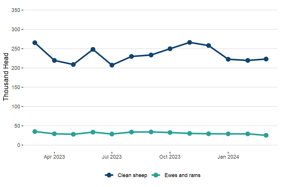 UK clean sheep slaughterings were down 16% on March 2023 at 988,000 head. Mutton and lamb production was 24,000 tonnes, 16% lower than in March 2023.