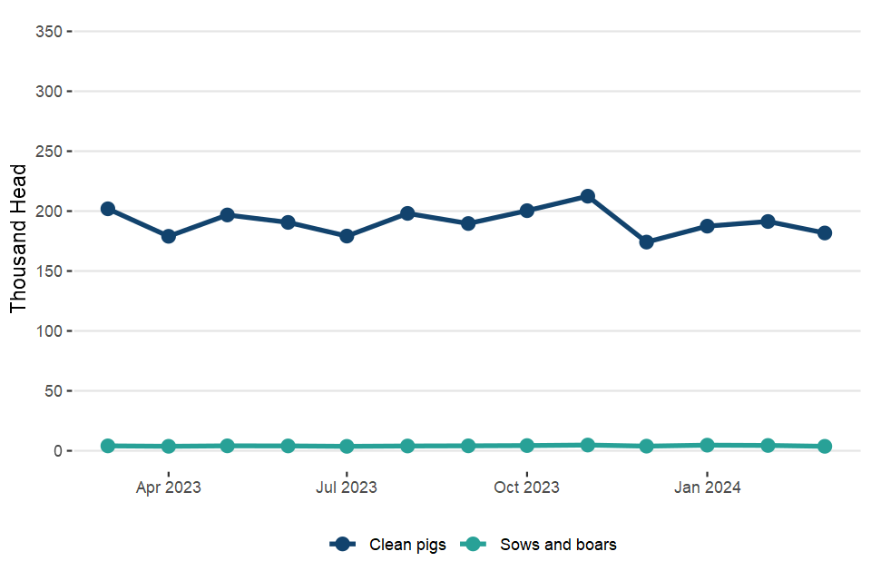 UK clean pig slaughterings were down 10% on March 2023 at 805,000 head. Pigmeat production was 75,000 tonnes, 8.6% lower than in March 2023.