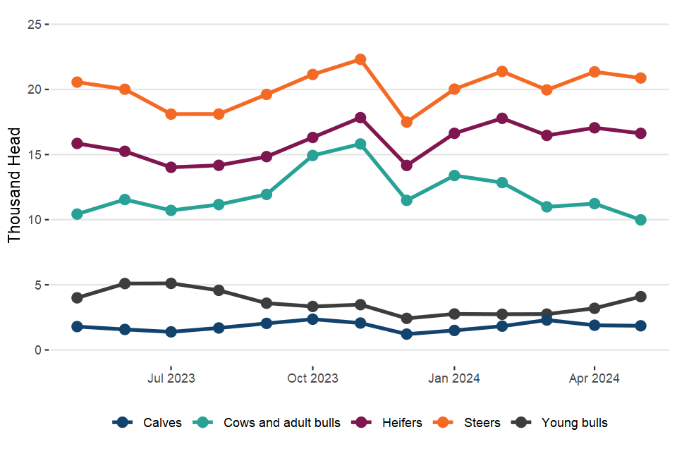 UK prime cattle (steers, heifers and young bulls) slaughterings in May 2024 were up 2.9% on May 2023 at 184,000 head. Beef and veal production was 78,000 tonnes, 1.4% higher than in May 2023.