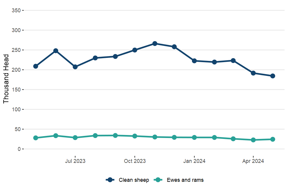 UK clean sheep slaughterings were down 12% on May 2023 at 817,000 head. Mutton and lamb production was 20,000 tonnes, 10% lower than in May 2023.