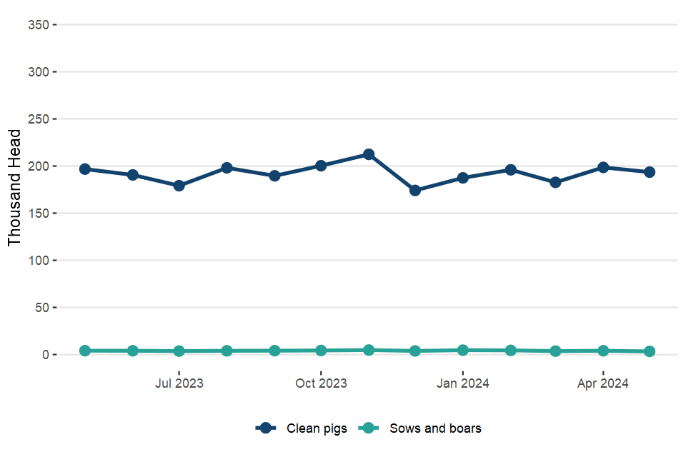 UK clean pig slaughterings were down 1.6% on May 2023 at 857,000 head. Pigmeat production was 79,000 tonnes, 0.7% lower than in May 2023.