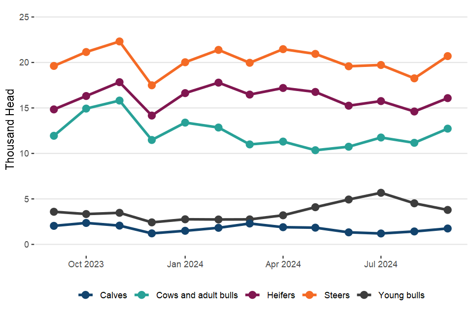 UK prime cattle (steers, heifers and young bulls) slaughterings in September 2024 were up 5% on September 2023 at 171,000 head. Beef and veal production was 76,000 tonnes, 5.5% higher than in September 2023. figure 2.1