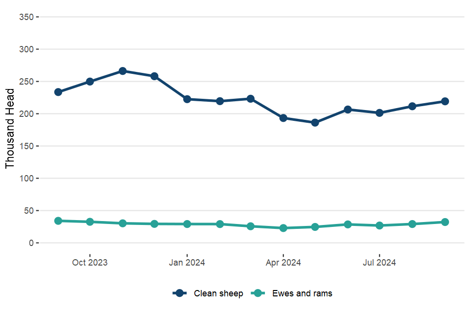UK clean sheep slaughterings were down 8.7% on September 2023 at 914,000 head. Mutton and lamb production was 21,000 tonnes, 6.8% lower than in September 2023.figure 2.3