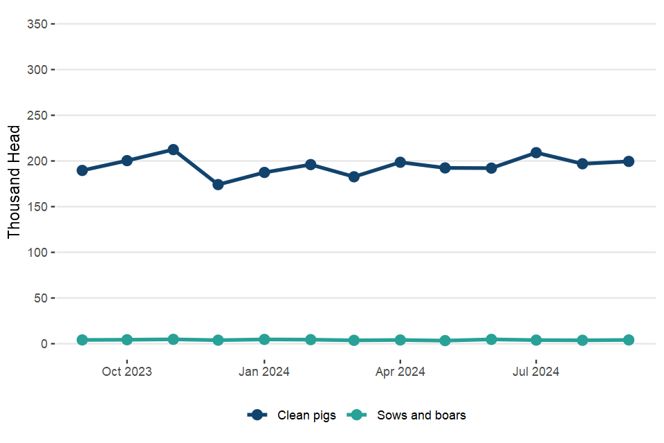 UK clean pig slaughterings were up 5.2% on September 2023 at 855,000 head. Pigmeat production was 79,000 tonnes, 5.2% higher than in September 2023.figure 2.3