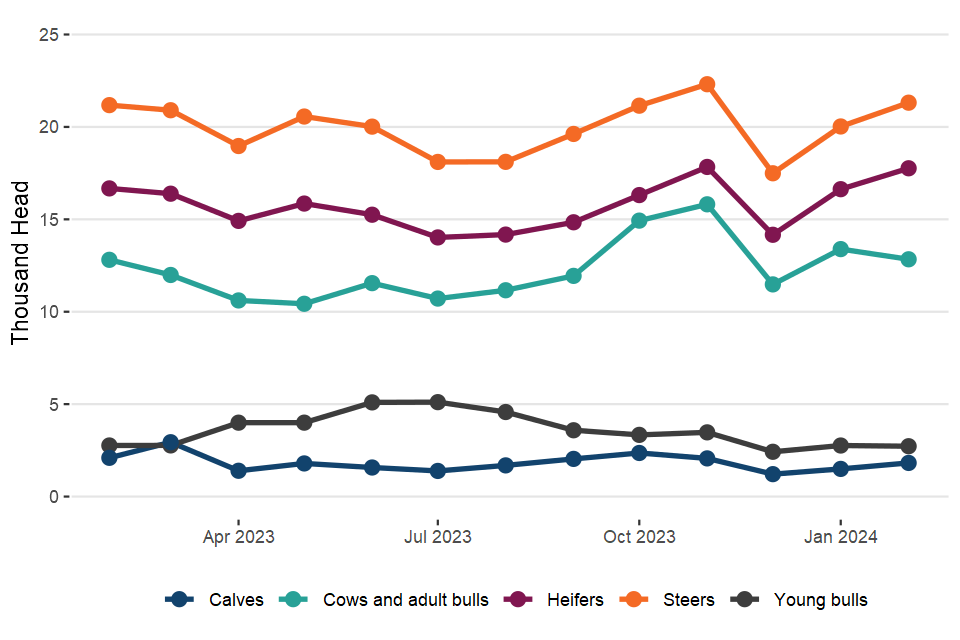 Monthly UK statistics on cattle, sheep and pig slaughter and meat production - February 2024 (published 14 March 2024)