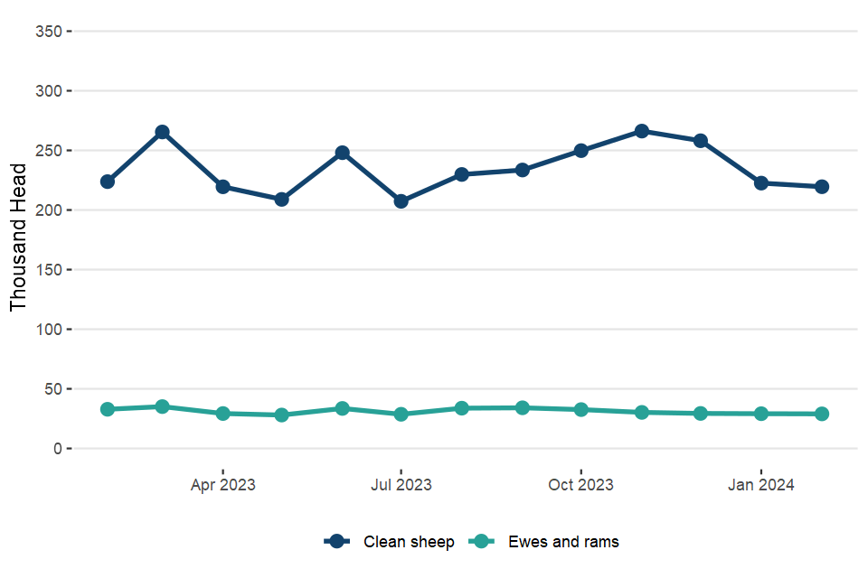 UK clean sheep slaughterings were up 1.6% on February 2023 at 909,000 head. Mutton and lamb production was 22,000 tonnes, 0.9% higher than in February 2023.