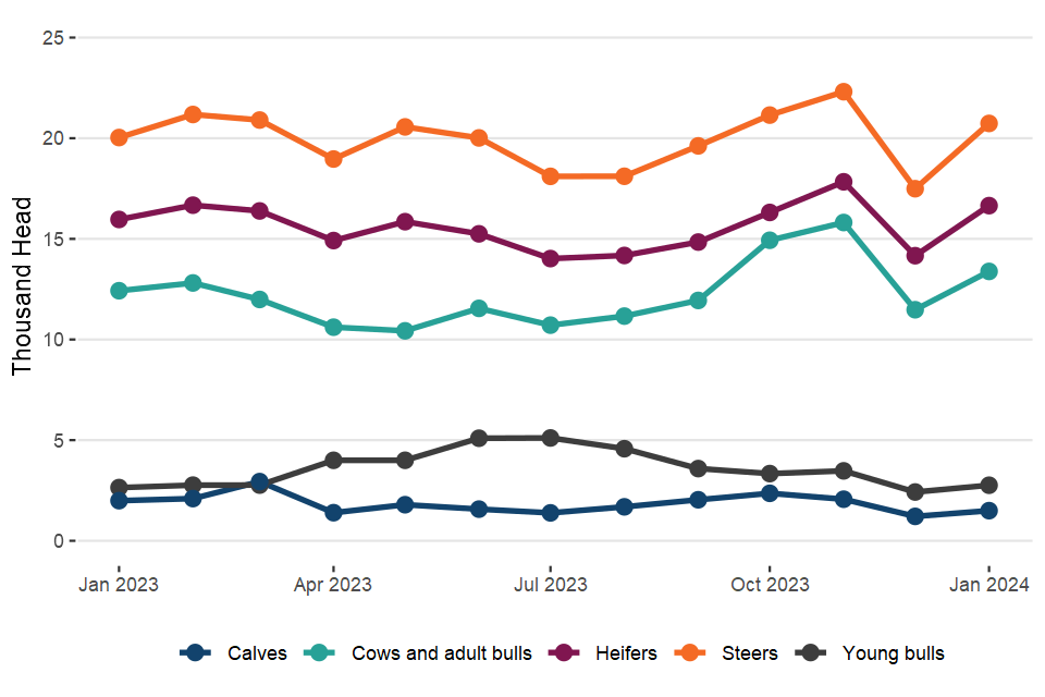 Monthly UK statistics on cattle, sheep and pig slaughter and meat production - January 2024 (published 15 February 2024)