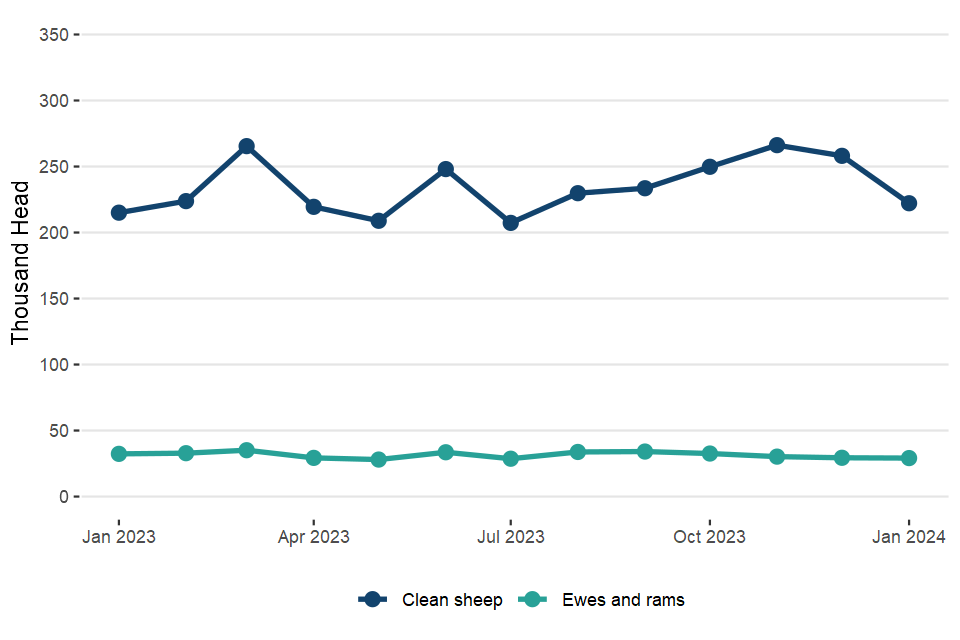 UK clean sheep slaughterings were up 3.3% on January 2023 at 984,000 head. Mutton and lamb production was 23,000 tonnes, 2.8% higher than in January 2023.