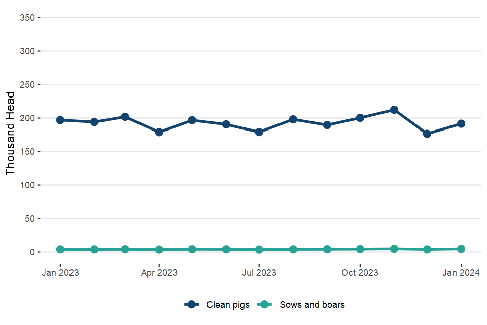UK clean pig slaughterings were down 2.7% on January 2023 at 849,000 head. Pigmeat production was 80,000 tonnes, 0.1% lower than in January 2023.
