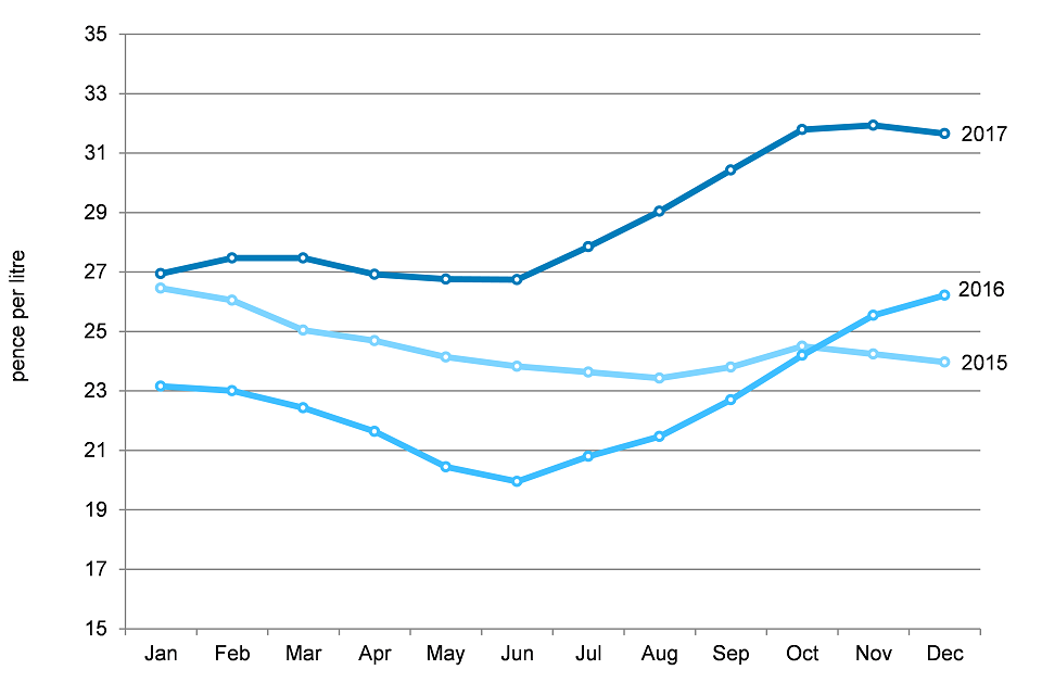 United Kingdom farm-gate milk price (pence per litre) to December 2017