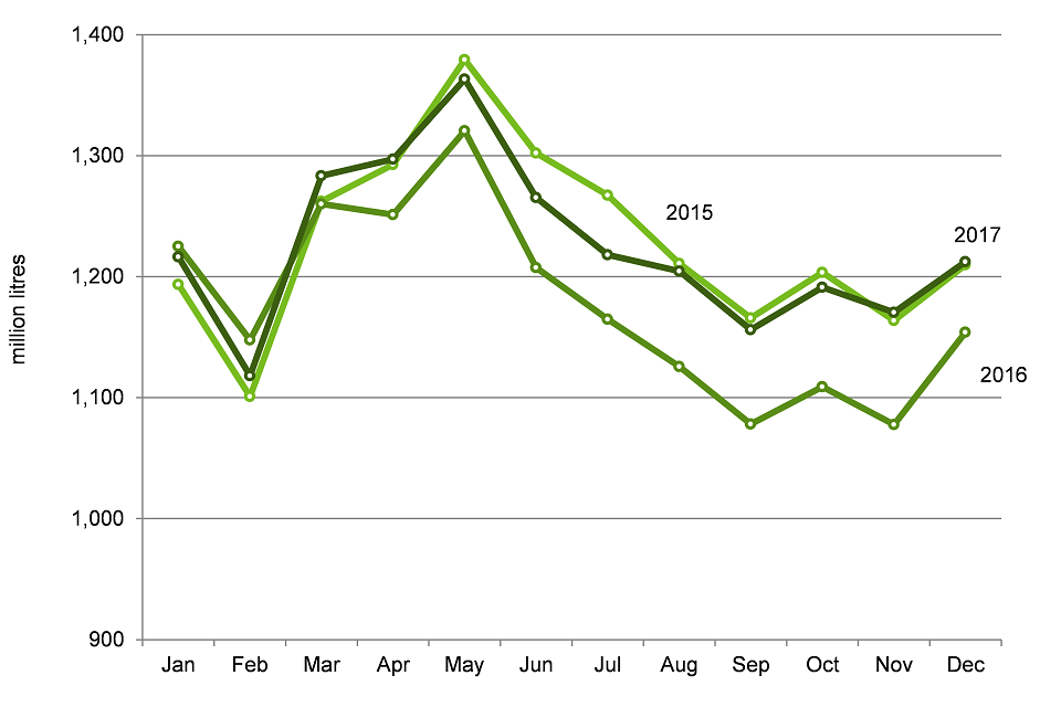 Recent years have shown increased production between February and May in line with the spring flush, which brings increased volumes followed by falls in production through to September and then an increase in October. December volumes increased following seasonal trends to 1212 million litres, a rise of 3.6% on the previous month.