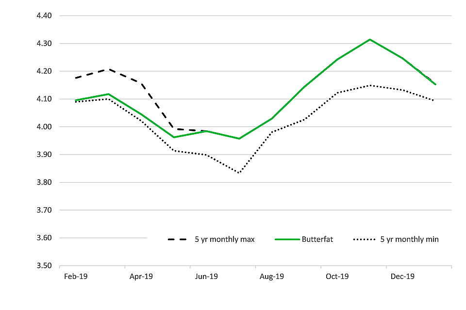 Butterfat is down 2.2% on last month at 4.15%. Compared to last year butterfat is 1.5% higher than January 2019. (Figures 1.3a).