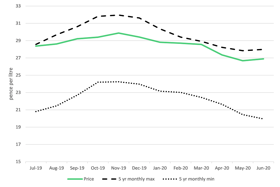 United Kingdom farm-gate milk price (pence per litre) to June 2020
