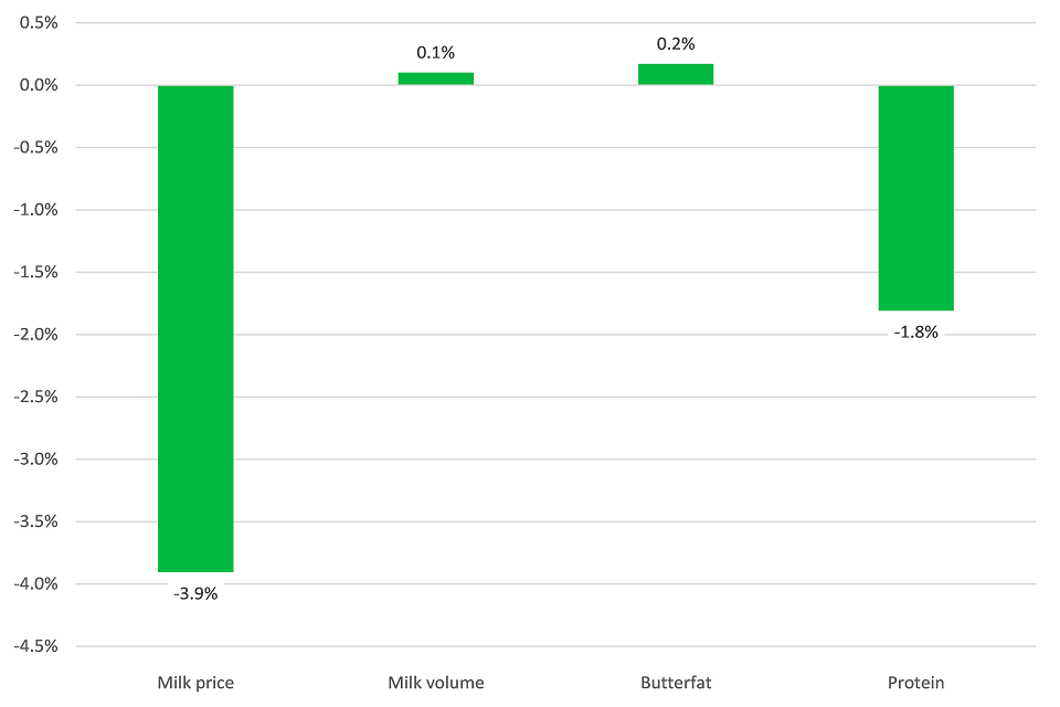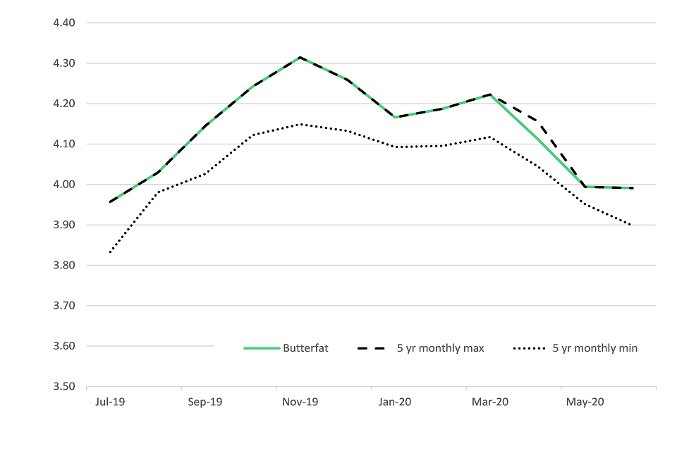 Butterfat is down 0.1% on last month at 3.99%. Compared to last year butterfat is 0.2% higher than June 2019. (Figures 1.3a).
