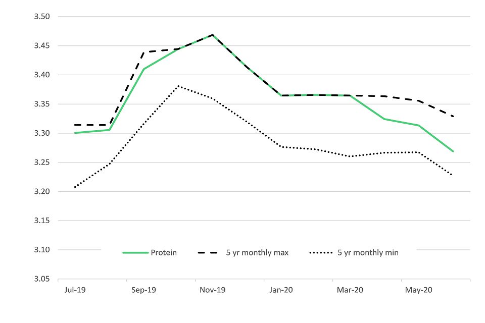 Protein is down 1.3% on last month at 3.27%. Compared to last year protein is 1.8% lower than June 2019. (Figures 1.3b).