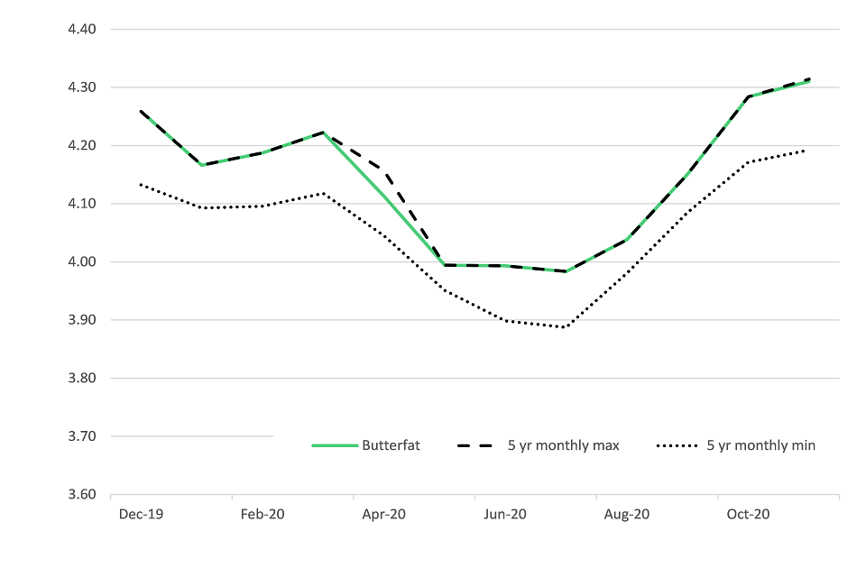 Butterfat is up 0.6% on last month at 4.31%. Compared to last year butterfat is 0.1% lower than November 2019. (Figures 1.3a).