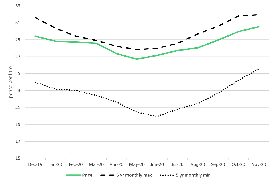 The UK average farm-gate milk price for November 2020 is 30.54 pence per litre (ppl). This represents a 1.9% (0.58 ppl) increase on October 2020 and a 2.2% increase on the same month last year. (Figure 1.2).