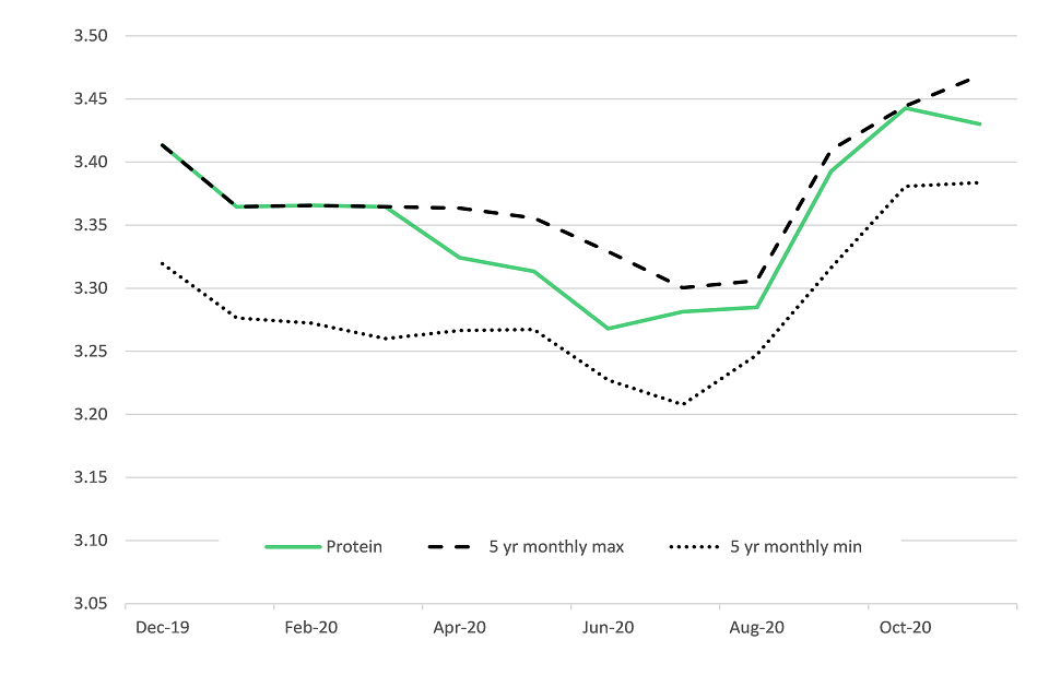Protein is down 0.4% on last month at 3.43%. Compared to last year protein is down 1.1% on November 2019. (Figures 1.3b).