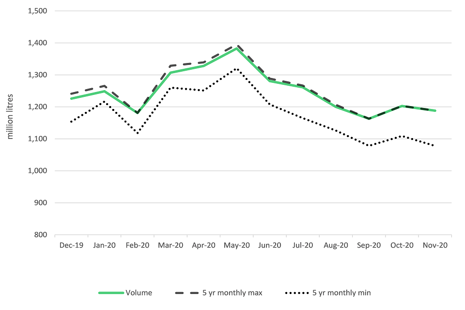 November volumes are 1,188 million litres down 1.2% on October 2020 and 2.1% higher than November 2019. (Figure 1.4).