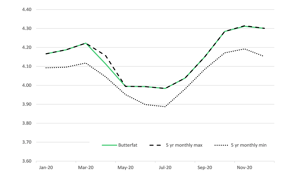 Butterfat is down 0.3% on last month at 4.30%. Compared to last year butterfat is 1.0% higher than December 2019. (Figures 1.3a).