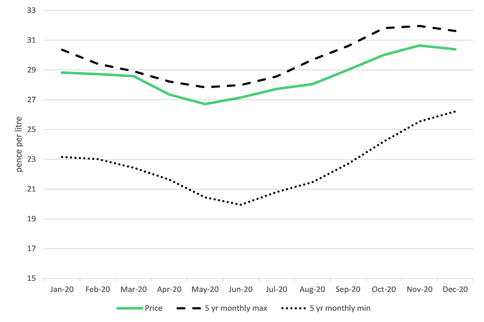 The UK average farm-gate milk price for December 2020 is 30.38 pence per litre (ppl). This represents a 0.9% (0.26 ppl) decrease on November 2020 and a 3.3% increase on the same month last year. (Figure 1.2).