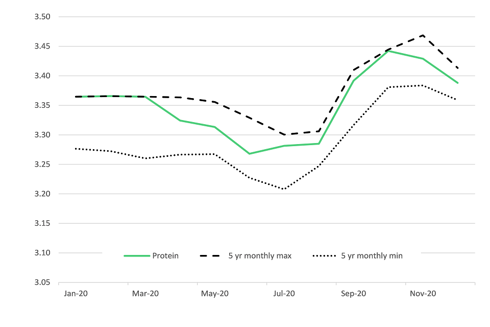 Protein is down 1.2% on last month at 3.39%. Compared to last year protein is down 0.7% on December 2019. (Figures 1.3b).
