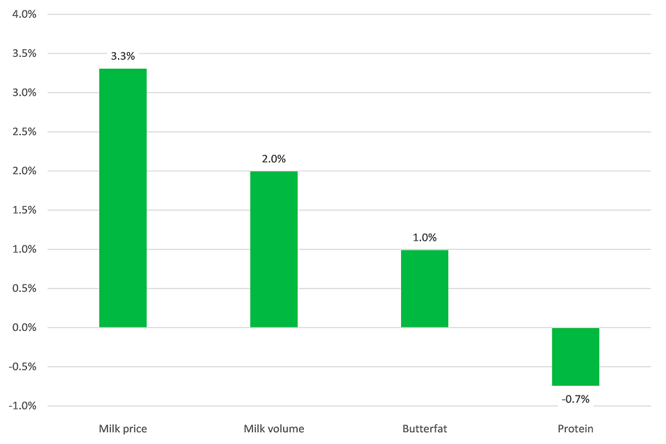 Figures 1.2 to 1.4 above show the values for the latest 12 months along with the maximum and minimum monthly values. There is a strong positive correlation between milk composition (butterfat and protein content) and milk price.