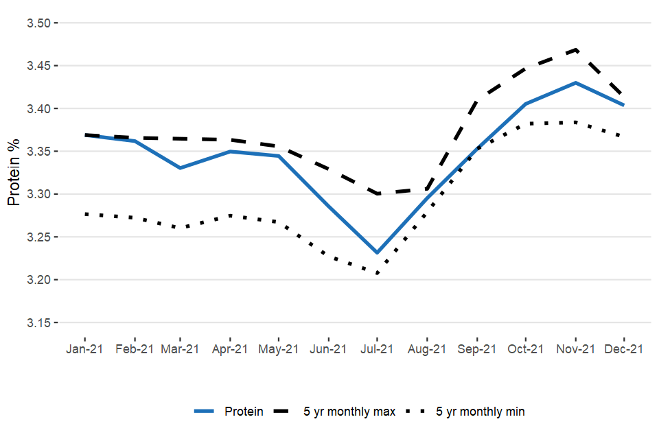 Protein is down 0.8% on last month at 3.40%. Compared to last year protein is 0.3% higher than December 2020. (Figures 1.3b).