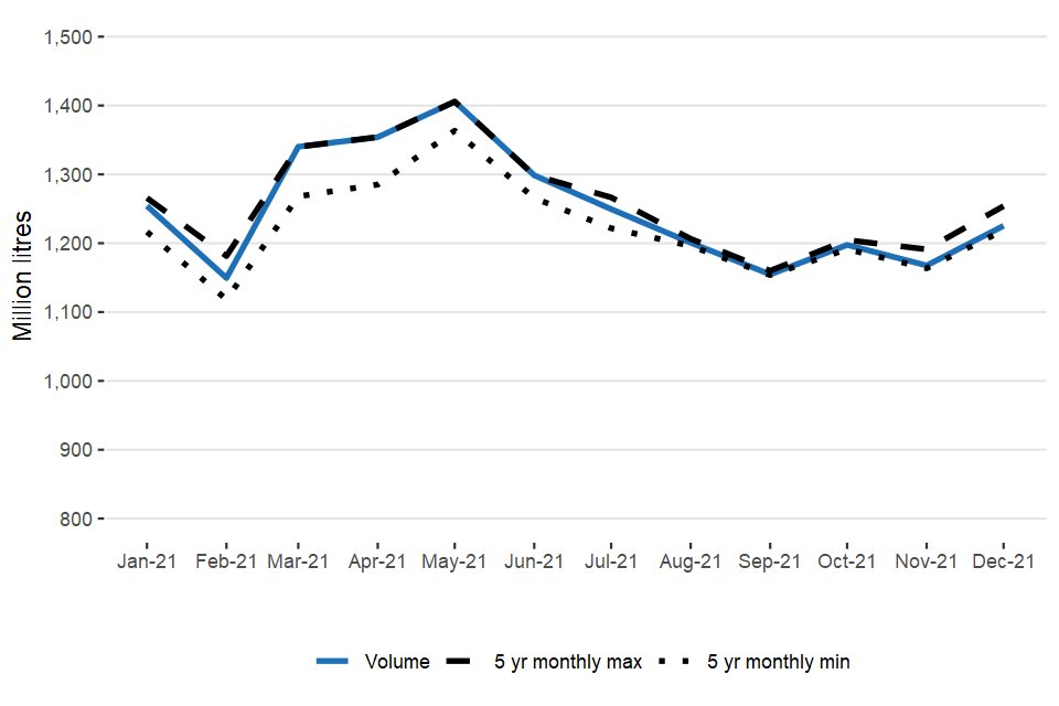 December volumes are 1,225 million litres up 4.9% on November 2021 and 2.3% lower than December 2020. (Figure 1.4).