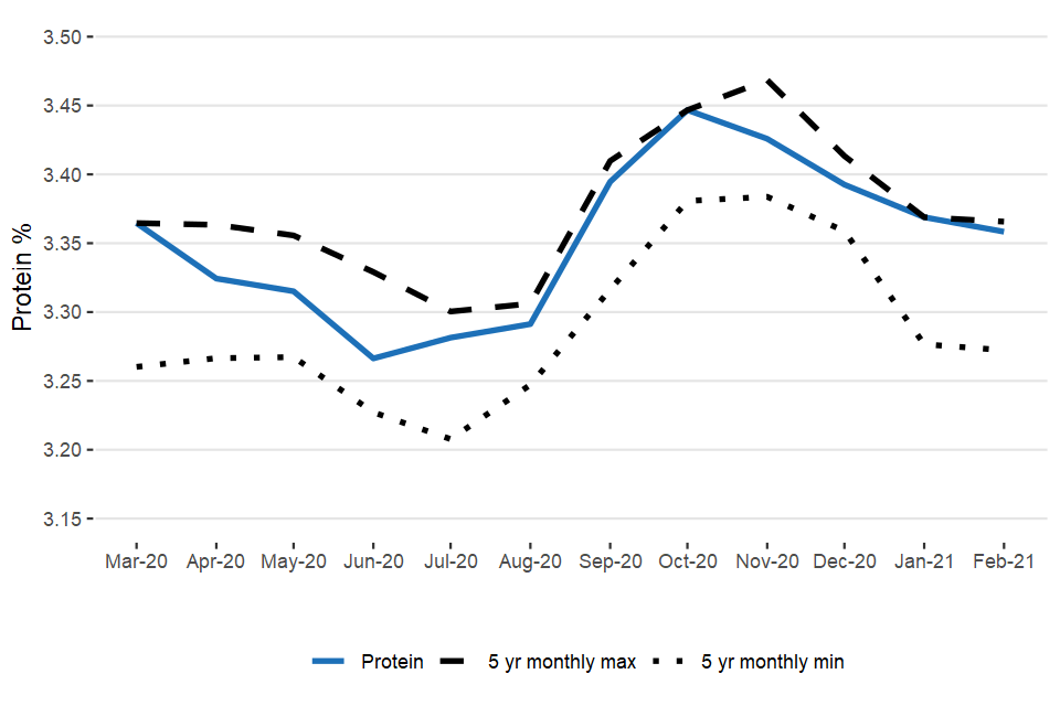 Protein is down 0.3% on last month at 3.36%. Compared to last year protein is 0.2% lower than February 2020. (Figures 1.3b).