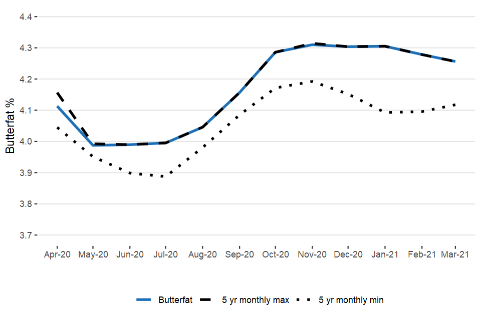 Butterfat is down 0.6% on last month at 4.28%. Compared to last year butterfat is 2.2% higher than February 2020. (Figures 1.3a).