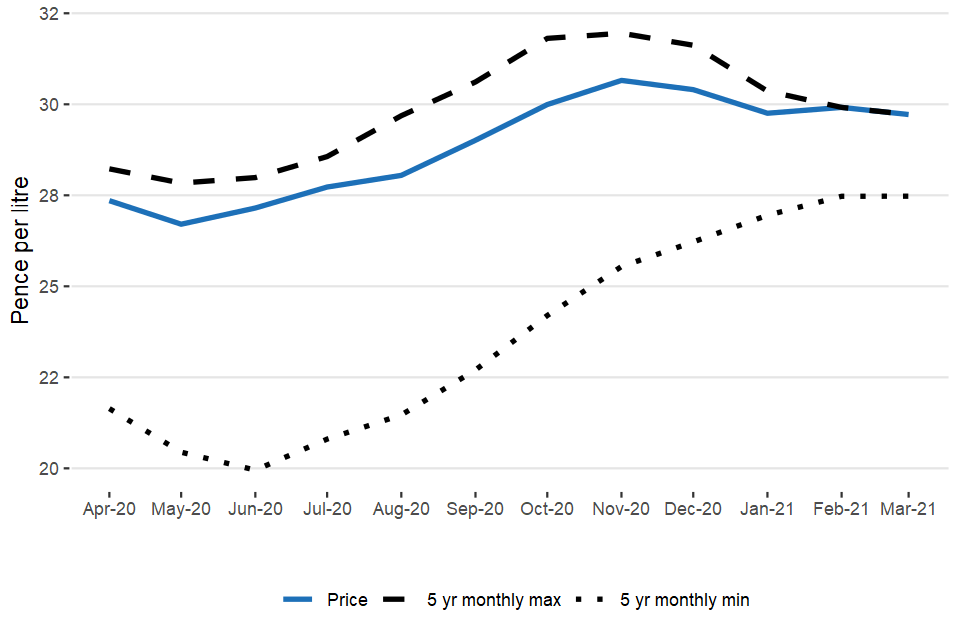 The UK average farm-gate milk price for February 2021 is 29.75 pence per litre (ppl). This represents a 2.1% (0.65 ppl) decrease on January 2021 and a 3.2% increase on the same month last year. (Figure 1.2).