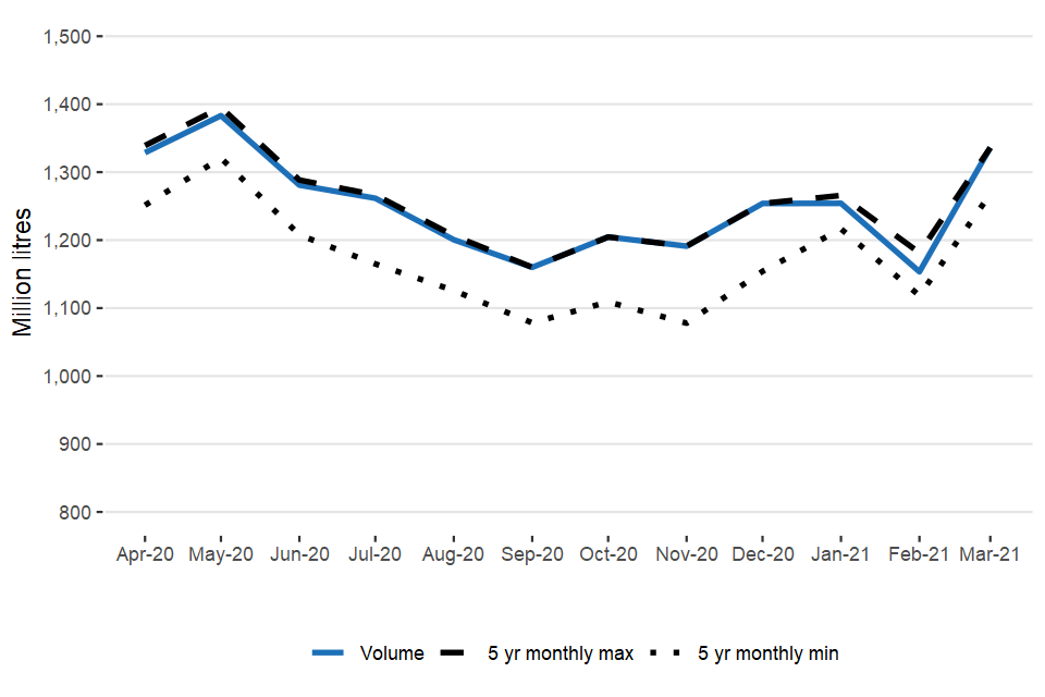 March volumes are 1,336 million litres up 16% on February 2021 and 2.2% lower than March 2020. (Figure 1.4).