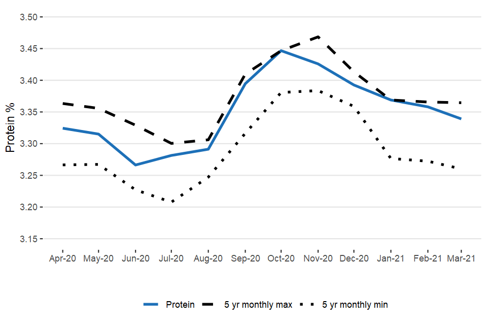 Protein is down 0.6% on last month at 3.34%. Compared to last year protein is 0.8% lower than March 2020. (Figures 1.3b).