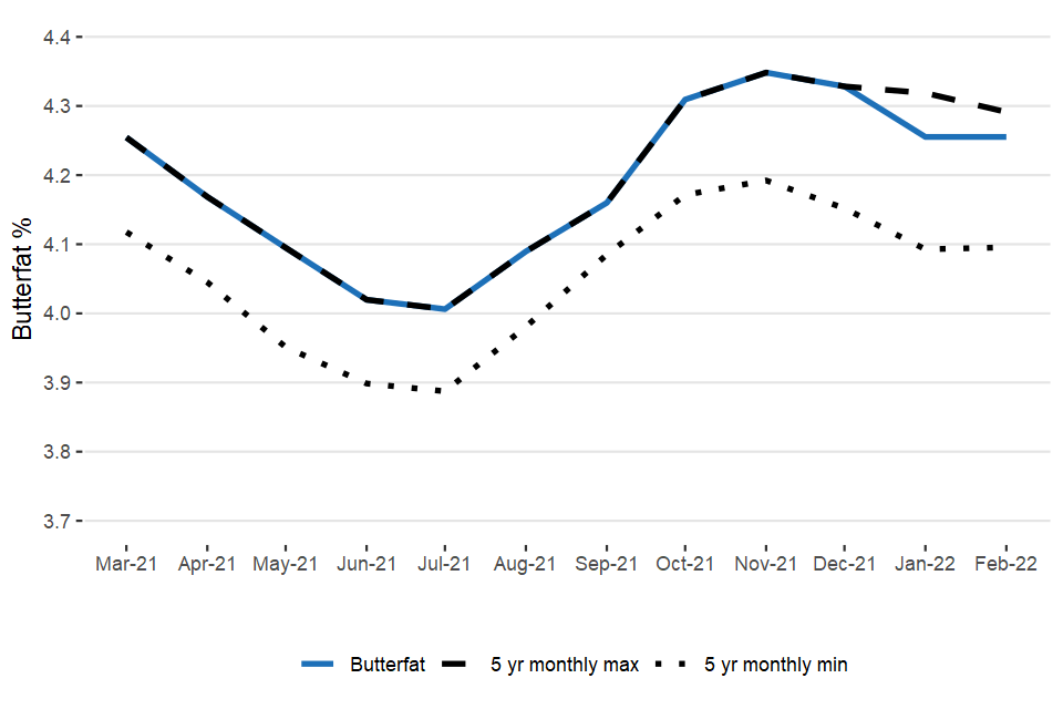 Butterfat is unchanged on last month at 4.26%. Compared to last year butterfat is 0.8% lower than February 2021. (Figures 1.3a).