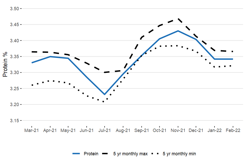 Protein is unchanged on last month at 3.34%. Compared to last year protein is 0.6% lower than February 2021. (Figures 1.3b).