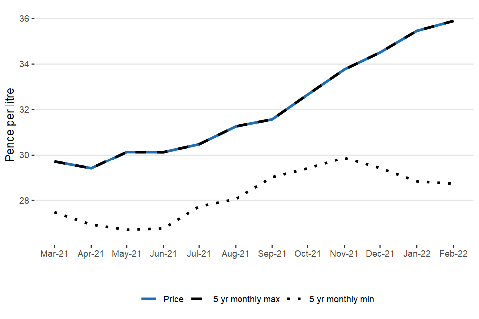 The UK average farm-gate milk price for February 2022 is 35.89 pence per litre (ppl). This represents a 1.2% (0.44 ppl) increase on January 2021 and a 20% increase on the same month last year. (Figure 1.2).