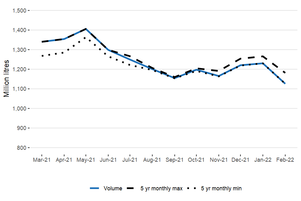 February volumes are 1,126 million litres down 8.5% on January 2022 and 2.0% lower than February 2021. (Figure 1.4).