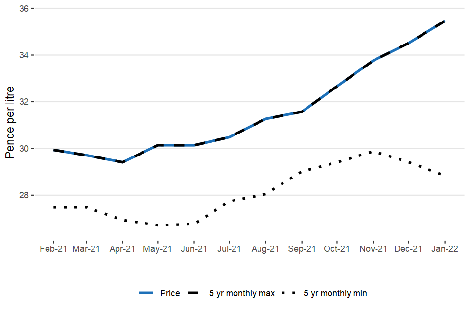 The UK average farm-gate milk price for January 2022 is 35.46 pence per litre (ppl). This represents a 2.8% (0.95 ppl) increase on December 2021 and a 19% increase on the same month last year. (Figure 1.2).