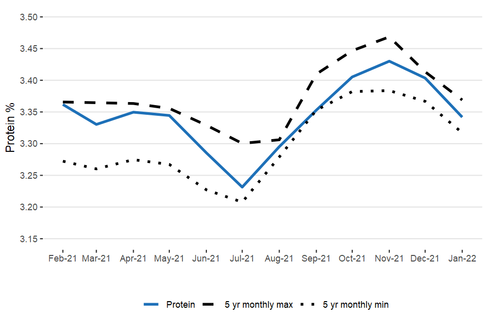 Protein is down 1.8% on last month at 3.34%. Compared to last year protein is 0.8% lower than January 2021. (Figures 1.3b).