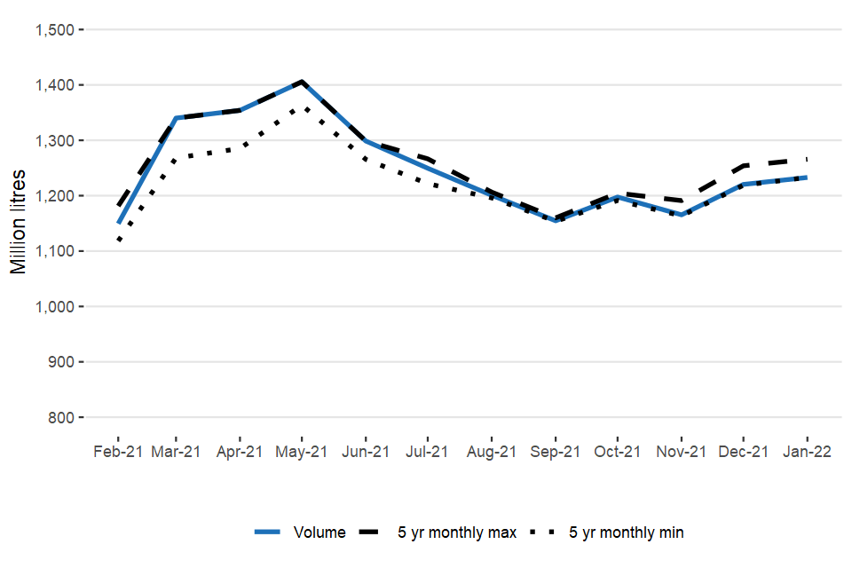 January volumes are 1,232 million litres up 1.0% on December 2021 and 1.7% lower than January 2021. (Figure 1.4).