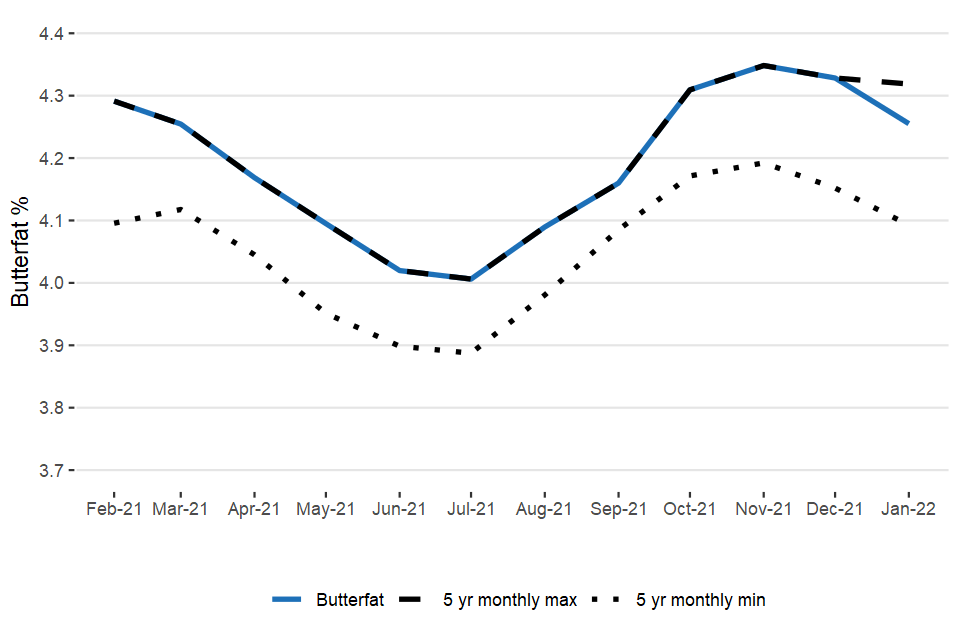 Butterfat is down 1.7% on last month at 4.26%. Compared to last year butterfat is 1.5% lower than January 2021. (Figures 1.3a).