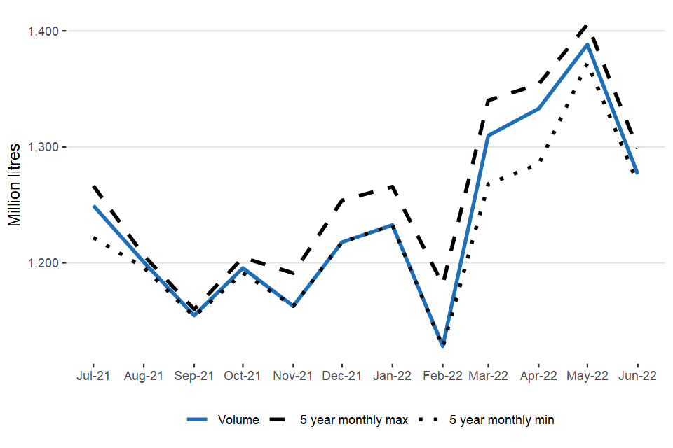 June volumes are 1,277 million litres, down 8.0% on May 2022 and 1.7% lower than June 2021. (Figure 1.4).
